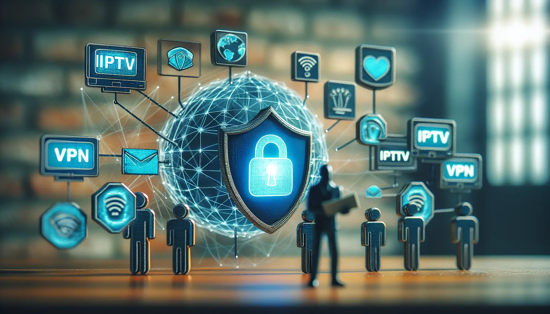 A glowing shield protecting a vibrant data stream flowing to a TV.